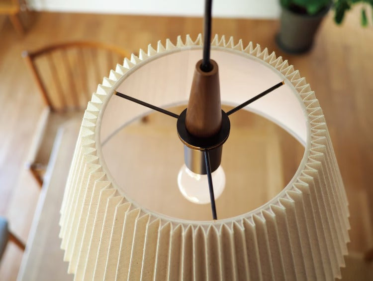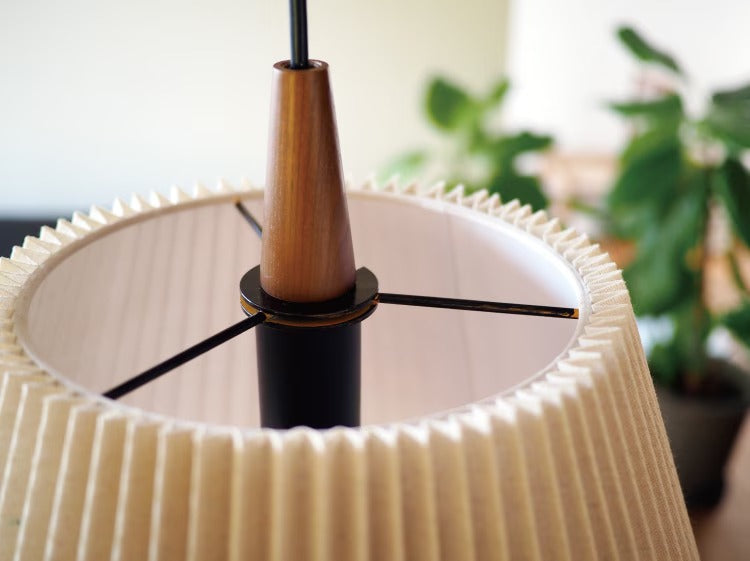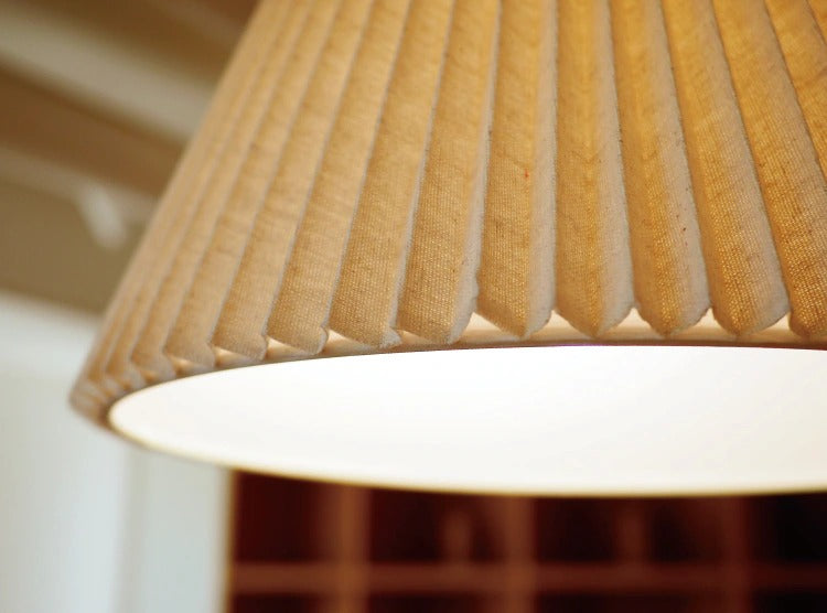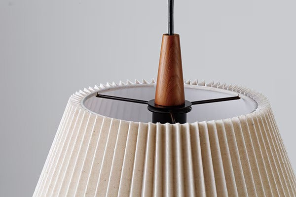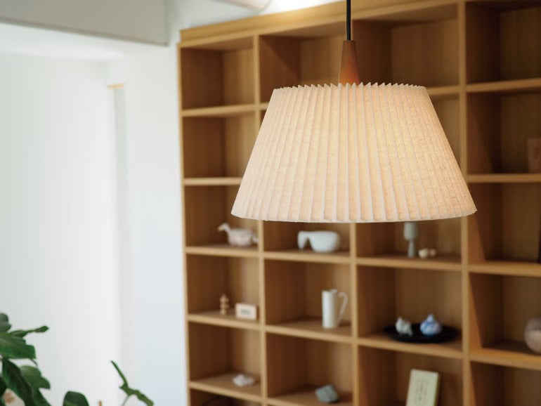 プリーツ状のファブリックシェードが柔らかな明かりを灯す、ナチュラルな印象のペンダントライト。