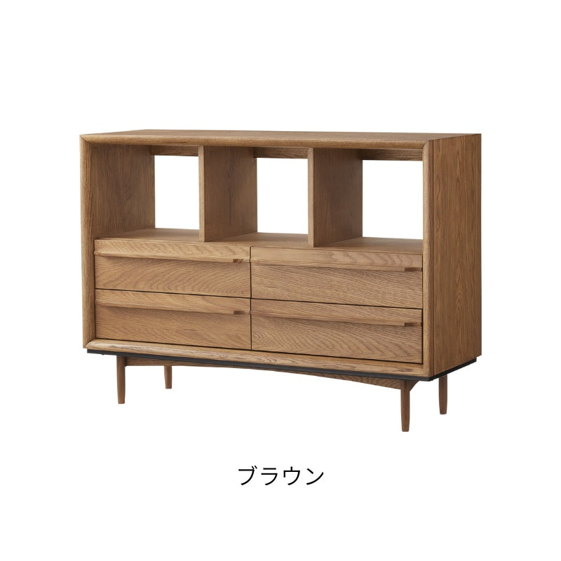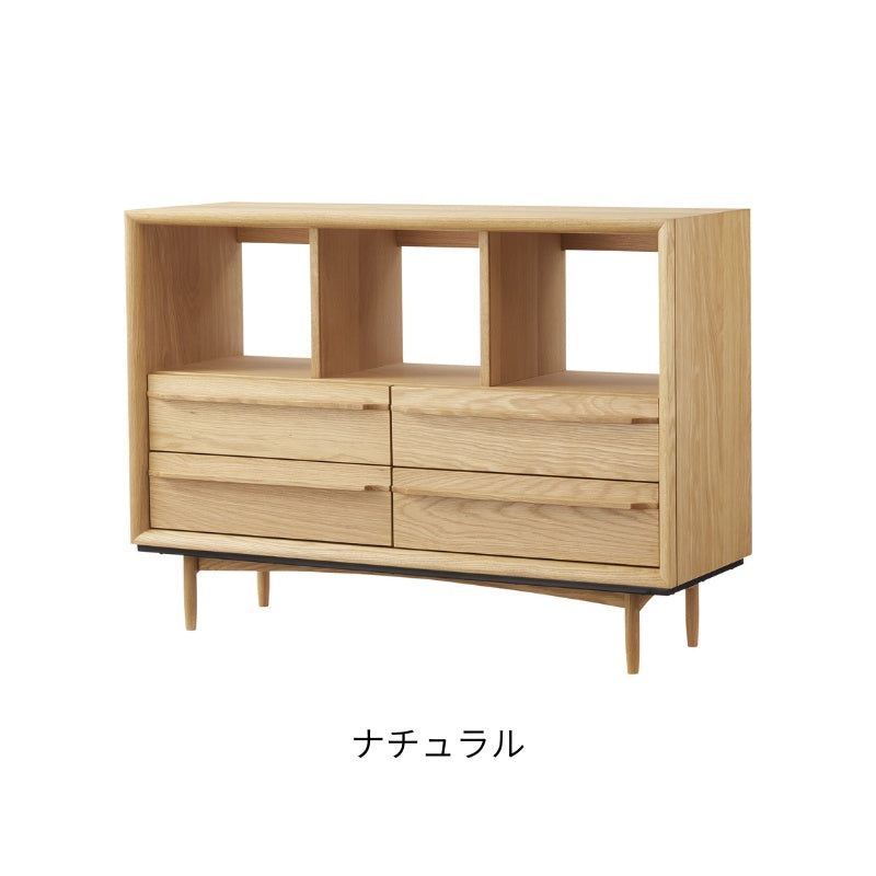 上段には3つに仕切られたオープンスペース、下段には4つに分かれた引き出し収納を配置。見せる収納と隠す収納をバランスよく組み合わせた設計で、日常の小物や読みかけの本、よく使う雑貨類をスタイリッシュに整理整頓できます。