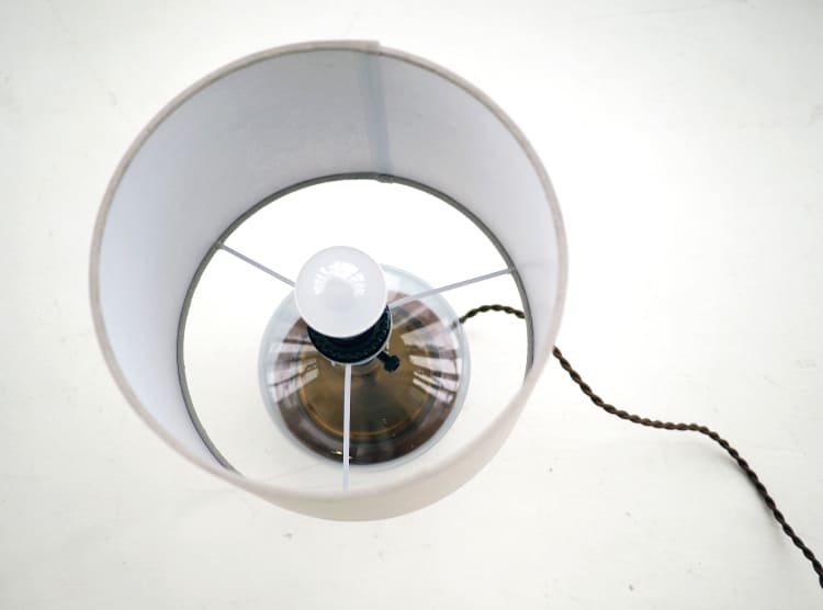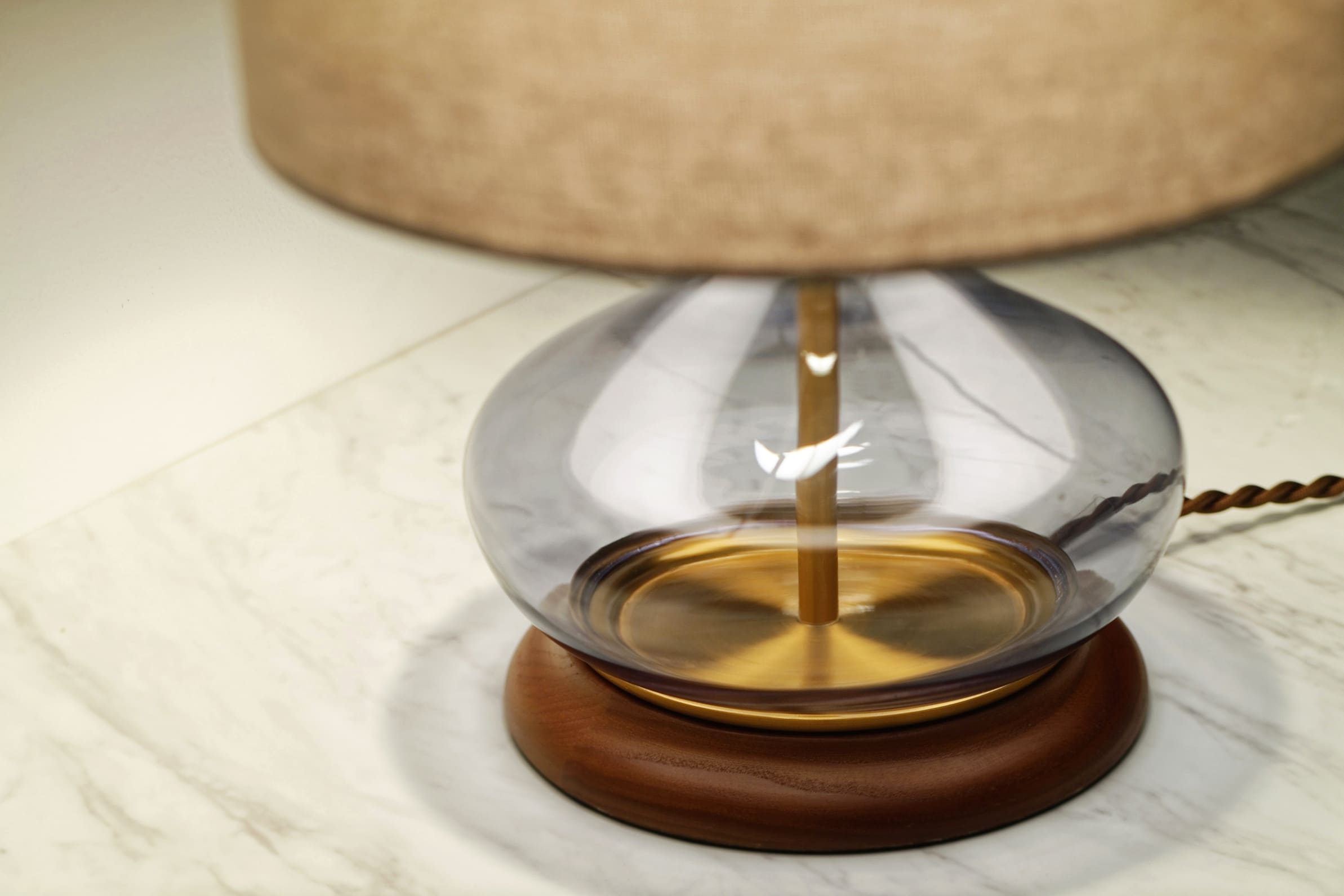 シェードにはファブリック生地を、本体にはガラス、ウッド、スチールと、性質も質感も異なる素材をバランスよく組み合わせました。