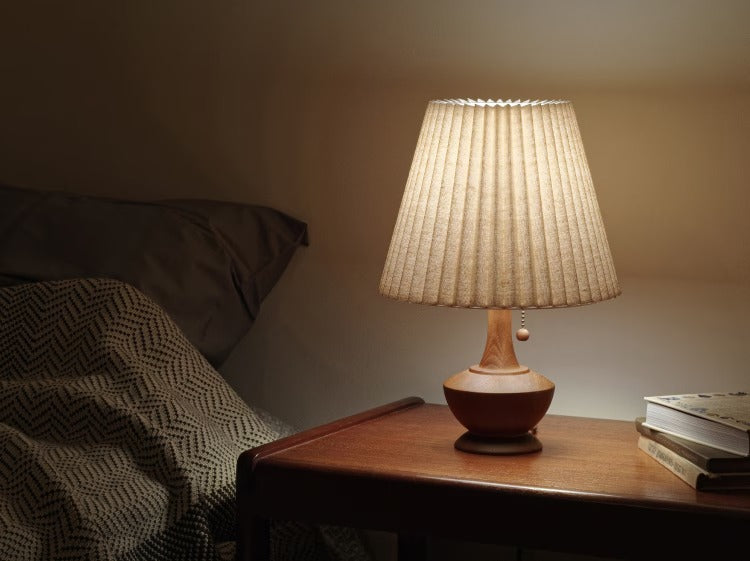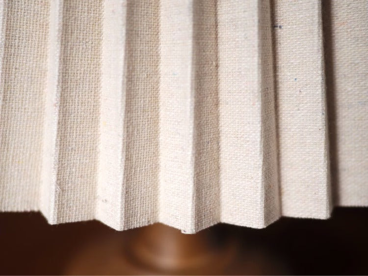 プリーツ状のシェードが心地よい明かりを灯すナチュラルなテーブルライト。