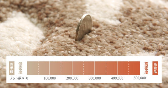 ウィルトン織りのノット数は繊維の密度を表しています。この数値が高いほどたくさんの糸が打ち込まれた、丈夫で優れたカーペットになります。